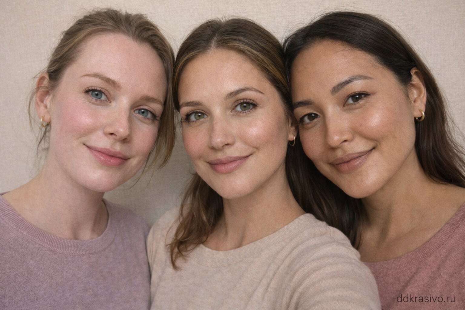 в качестве ориентира посмотрите на волосы и глаза. Это не правило, а обобщение: более глубокие оттенки кожи и более тёмные глаза часто идут вместе с тёплым подтоном, а очень светлая кожа и светлые глаза чаще с нейтральным или холодным.