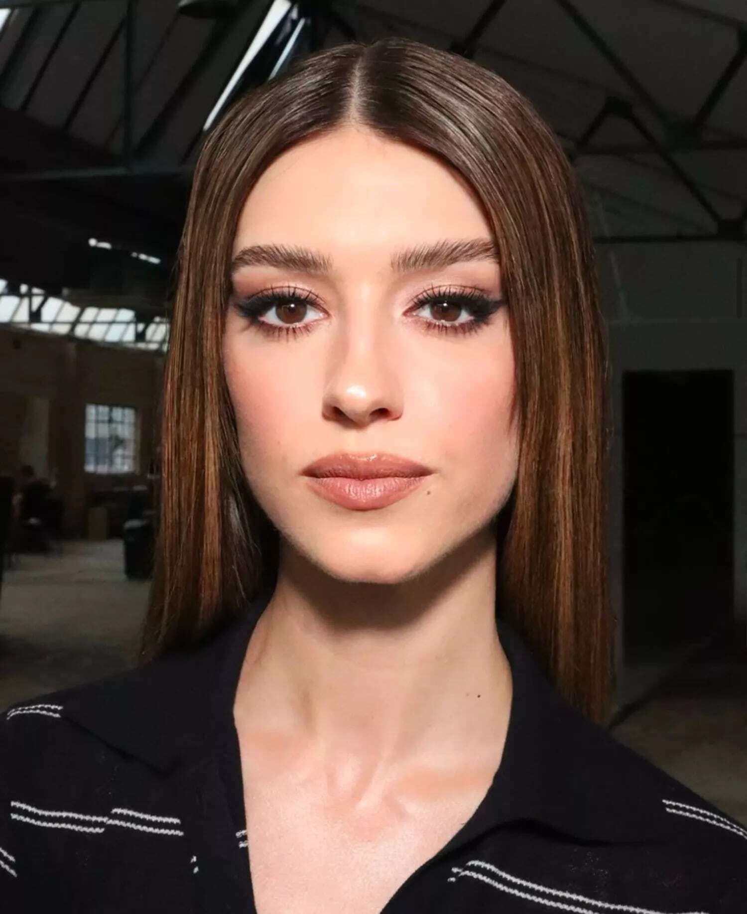Сильная база: контур, хайлайтер и румяна, чтобы скулы были заметнее. И два чётких штриха, которые собирают образ: плотная чёрная подводка и пушистые брови.